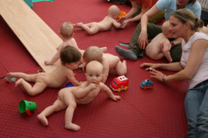 In der PEKiP®-Gruppe haben die Babys die Möglichkeit zum ersten Mal mit gleichaltrigen in